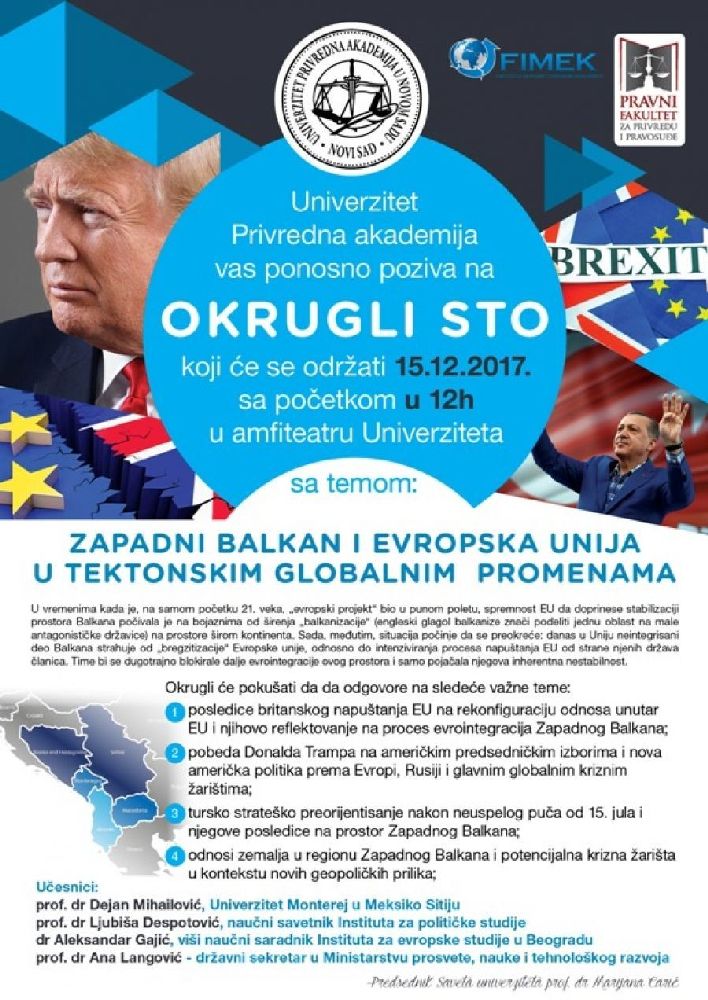 Univerzitet Privredna akademija Vas poziva na okrugli sto koji će se održati 15.12.2016. sa početkom u 12h u amfiteatru Pravnog fakulteta sa temom: