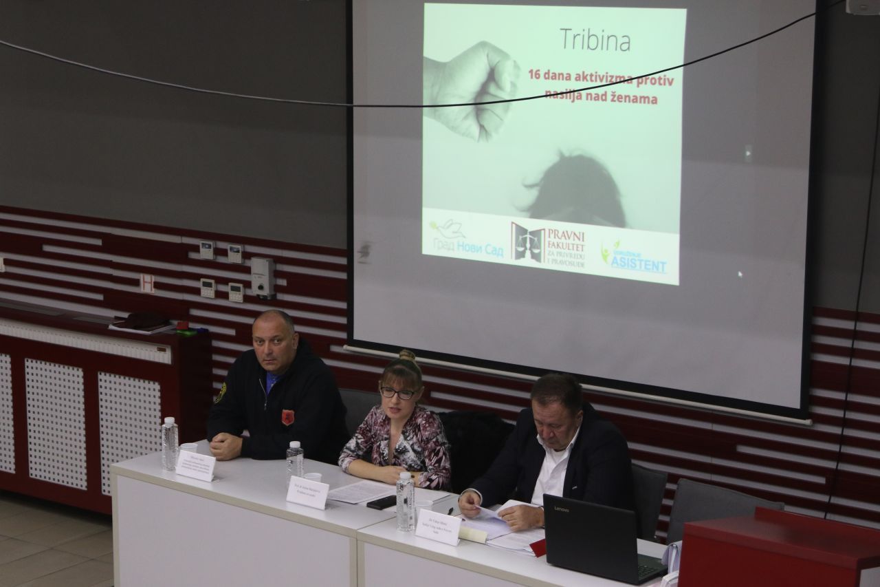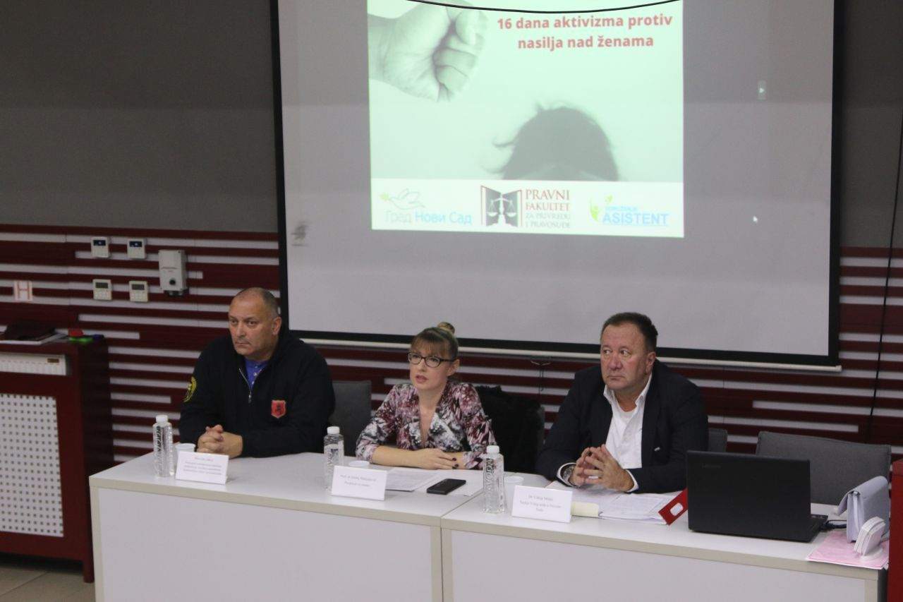 O fenomenološkim karakteristikama nasilja nad ženama, uzrocima, krivičnopravnom tretmanu i primerima iz prakse govorili su učesnici tribine: dr Vidoje Mitrić, sudija Višeg suda u Novom Sadu, prof. dr Jelena Matijašević, prodekan za nauku i glavna urednica naučnog časopisa „Pravo – teorija i praksa“ i Milorad Jakić, predsednik međunarodnog udruženja telohranitelja, instruktor samoodbrane, telohraniteljske zaštite i protivterorizma.