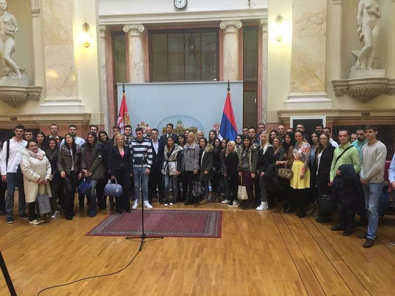 Studente je dočekao narodni poslanik Balint Pastor, koji je ukratko predstavio organizaciju i rad Narodne skupštine i način ostvarivanja prava i dužnosti narodnih poslanika. Takođe, studentima su se obratili i predstavnici Grupe za edukaciju i prezentaciju skupštinske baštine i objasnili da je upravo njihov posao priprema i realizacija poseta građana, domaćih i stranih delegacija Narodnoj skupštini kao i prezentacija rada Narodne skupštine. Predstavljena je i mala sala Doma Narodne skupštine, gde su studenti sedeli i čuli reč više o radnim telima Narodne skupštine koja se obrazuju za razmatranje predloga zakona i praćenje izvršavanja zakona. Objašnjen je postupak pripremanja i sazivanje sednice Narodne skupštine u redovnom zasedanju.