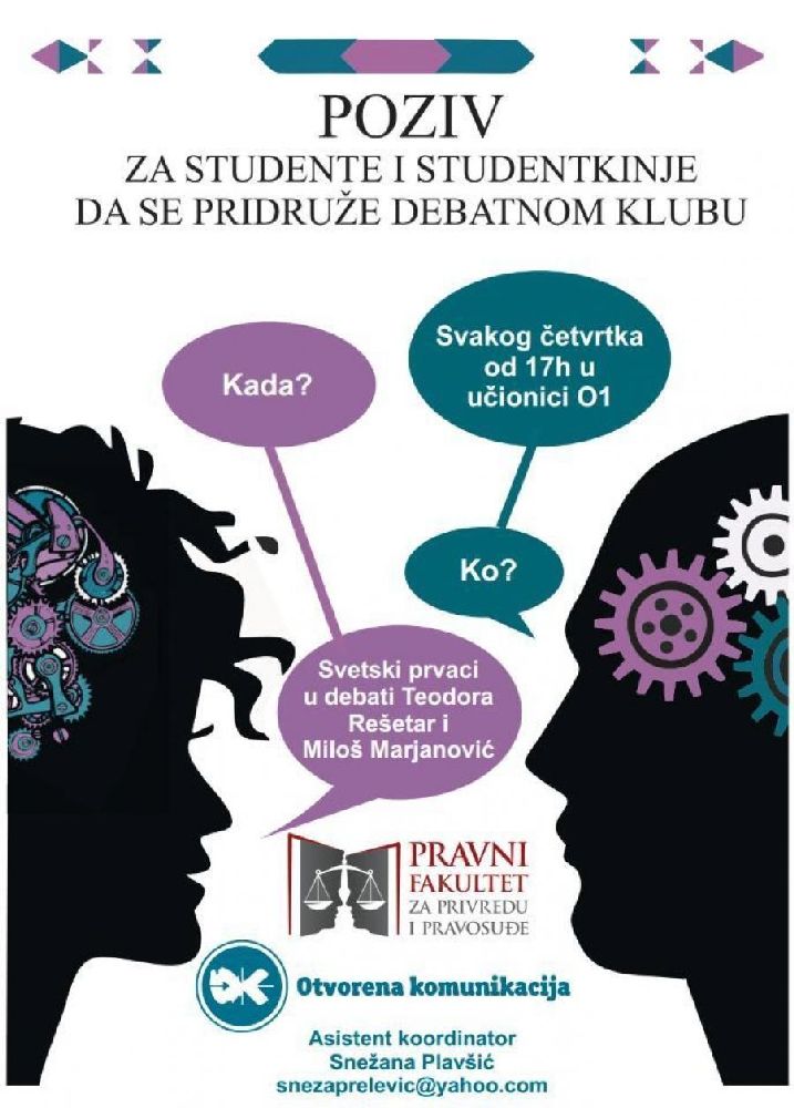 Pozivaju se studenti svih godina da se pridruže Debatnom klubu Pravnog fakulteta za privredu i pravosuđe u Novom Sadu. Radionice u okviru kursa će voditi svetski prvaci u debati Teodora Rešetar i Miloš Marjanović svakog četvrtka, počev od 2. marta 2017. godine od 17h u učionici O1. Pohađanje kursa je besplatno. Očekujemo vas.