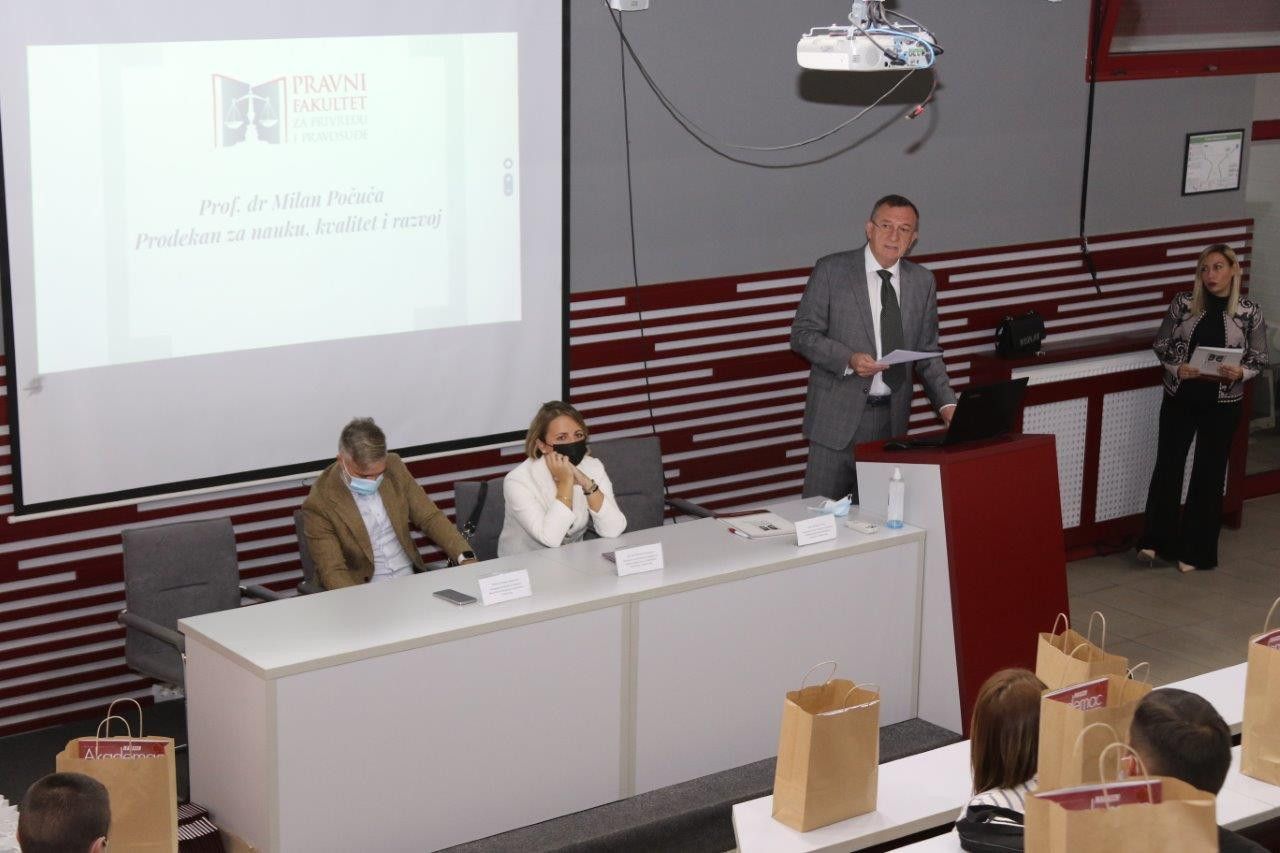 Prof. dr Milan Počuča je poželeo dobrodošlicu studentima i govorio o modelu organizacije nastave, visokostručnom kadru, savremeno koncipiranim udžbenicima, praksi u Višem sudu i advokatskim kancelarijama. „Hvala vam što ste nas izabrali za ustanovu u kojoj ćete narednih godina sticati znanja i veštine koje će vam koristiti čitav život. 20 godišnje iskustvo, nastavni i nenastavni kadar koji imamo i sa kojim ćete raditi tokom svojih studija garancija su, da ćete dobiti kvalitetno obrazovanje.“ – istakao je prof. dr Milan Počuča.