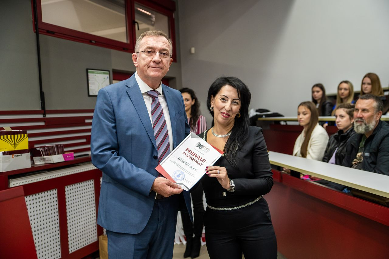 Nakon toga, prof. dr Milan Počuča uručio je priznanje i plaketu najboljoj studentkinji generacije 20/21. Jani Zečević, koja je na poklon dobila i laptop, dok je pohvalu za izuzetnost uručio studentkinji Heleni Mesaroš.
